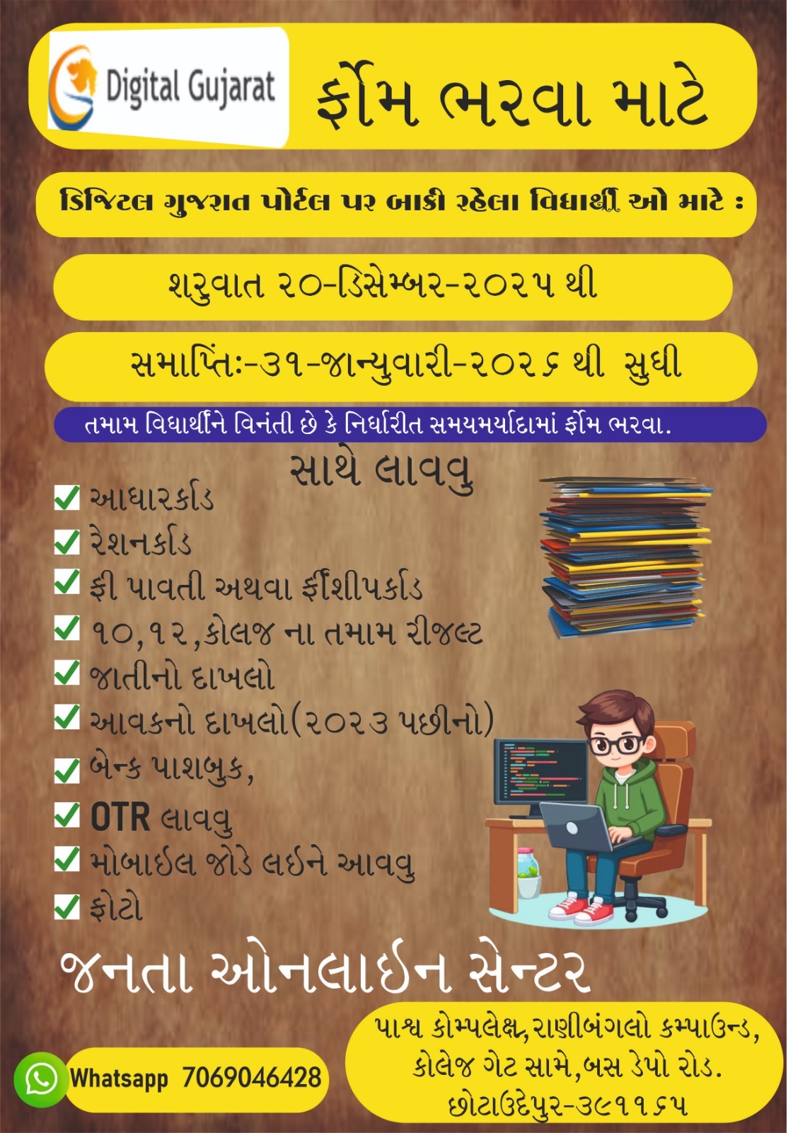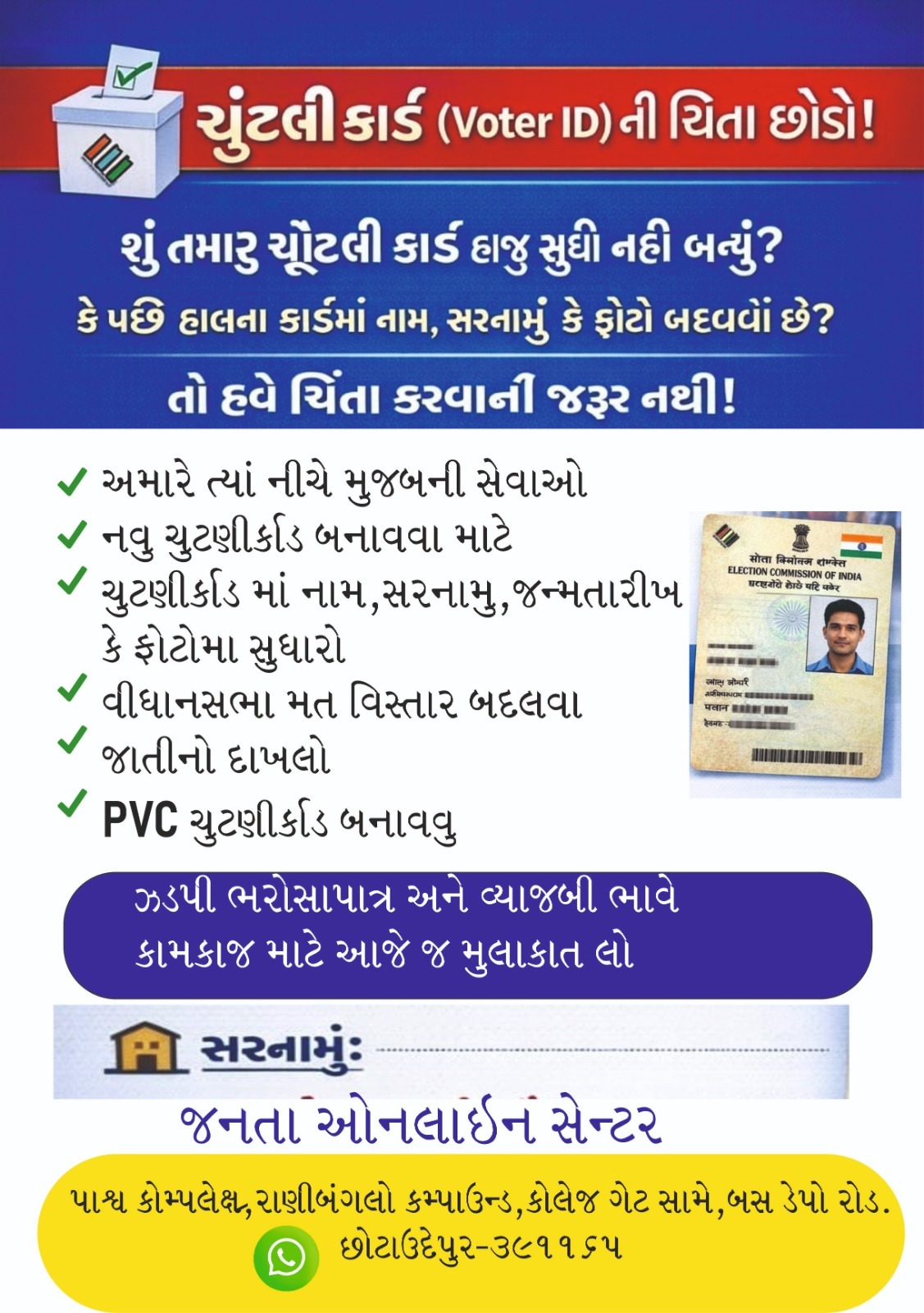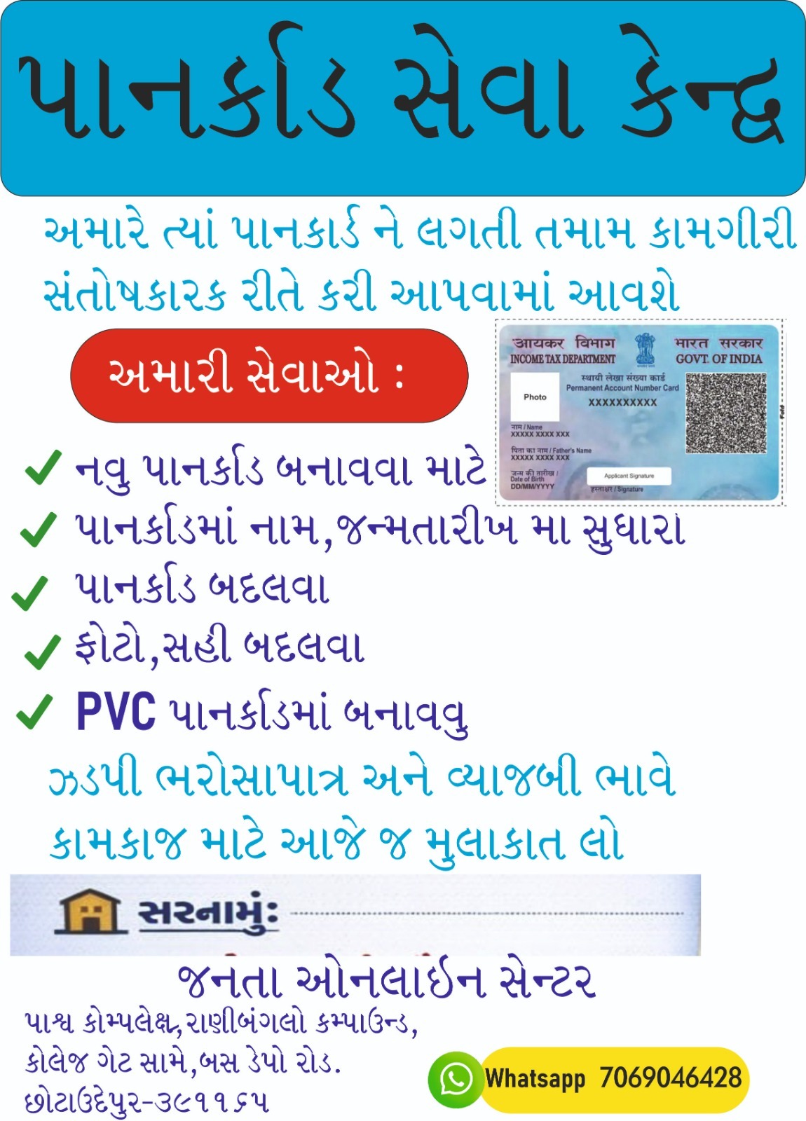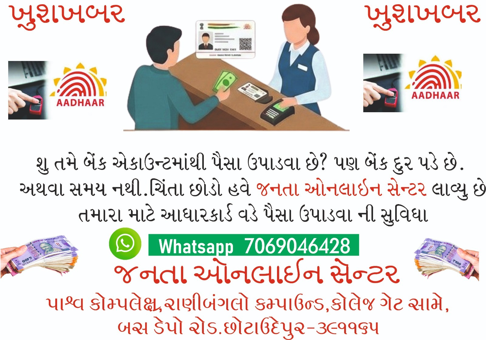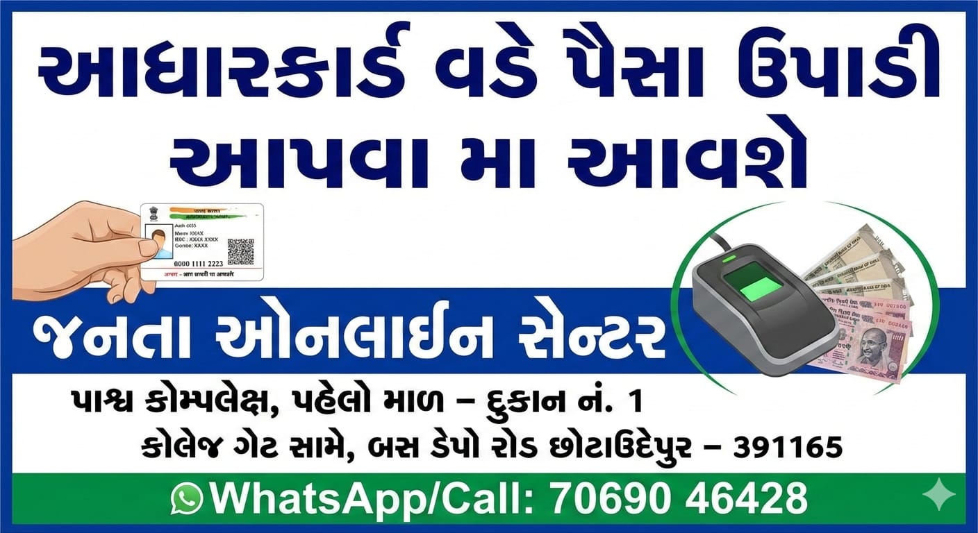 जनता ऑनलाइन सेंटर एक विश्वसनीय डिजिटल सेवा केंद्र है, जो आम नागरिकों को सरल, तेज़ और भरोसेमंद ऑनलाइन एवं सरकारी सेवाएँ प्रदान करने के लिए समर्पित है। हमारा उद्देश्य डिजिटल सेवाओं को सभी के लिए आसानी से उपलब्ध कराना है, विशेष रूप से उन लोगों के लिए जिन्हें ऑनलाइन प्रक्रियाओं में सही मार्गदर्शन की आवश्यकता होती है। हम आधार कार्ड, पैन कार्ड, वोटर आईडी, विभिन्न सरकारी ऑनलाइन फॉर्म भरना, प्रमाणपत्र सेवाएँ, बिल भुगतान तथा नौकरी और परीक्षा आवेदन जैसी अनेक सेवाएँ प्रदान करते हैं। हम हर कार्य में सटीकता, पारदर्शिता और समयबद्ध सेवा पर विशेष ध्यान देते हैं। जनता ऑनलाइन सेंटर में ग्राहक संतुष्टि हमारी सर्वोच्च प्राथमिकता है। ईमानदार सेवा, दस्तावेज़ों की सुरक्षित हैंडलिंग और सहयोगपूर्ण व्यवहार के साथ हम आपके सभी डिजिटल कार्यों को आसान और तनाव-मुक्त बनाते हैं।